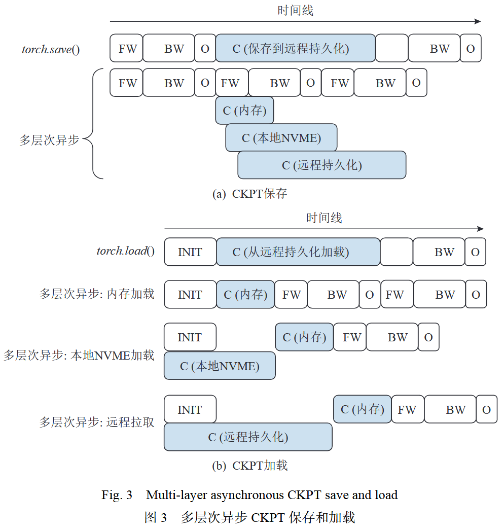 多层次异步检查点读写,通过共享内存和本地磁盘缓存降低故障恢复和加载开销,故障时即时保存检查点,优化通信操作的故障识别与恢复
